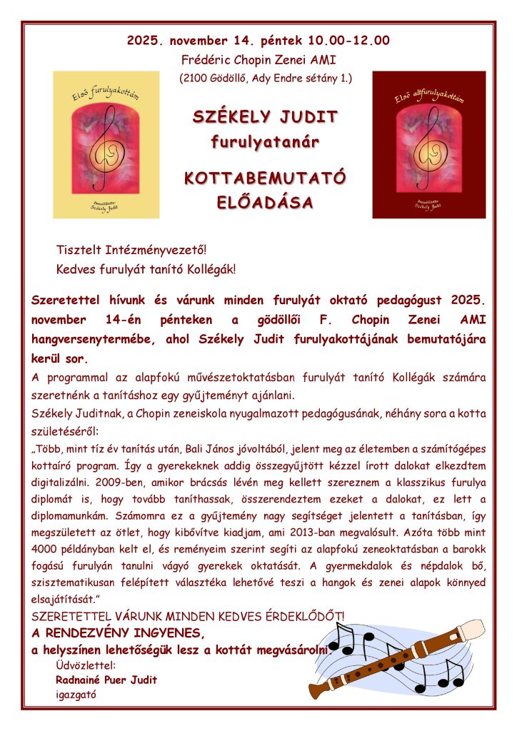 Esemény, Hírek, Könyv, kotta, Tanároknak Kottabemutató – Székely Judit: Első furulyakottám 2025.11.06. 2025. 11. 14-én, pénteken 10.00 órakor a Frederic Chopin Zenei AMI-ban (Gödöllő). Regisztráció: https://forms.gle/HGo3mkorNfooADcR8 Előző XVI. Nemzetközi Furulyaverseny - Érsekújvár Legújabb Erik Bosgraaf furulya mesterkurzus Budapesten
